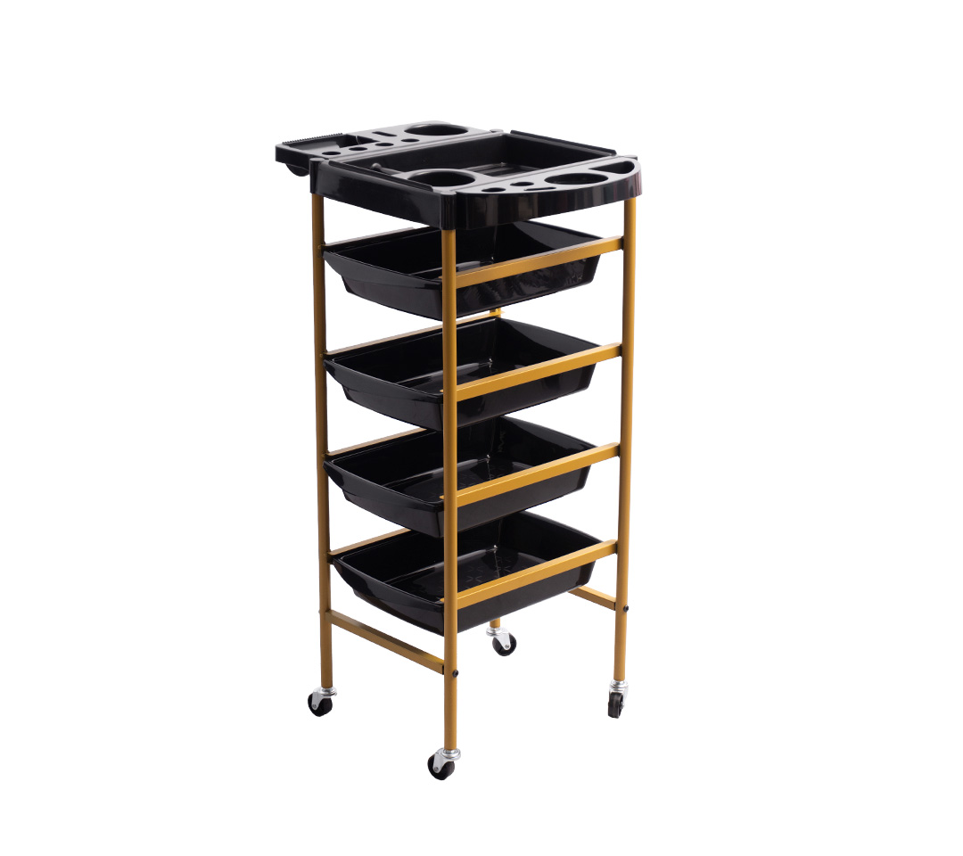 Gracias a su sistema de ruedas duraderas, este carrito se desplaza con facilidad por toda la estancia, lo cual es indispensable en un ambiente dinámico como el de una peluquería. Con su acabado elegante en negro, no solo añade funcionalidad sino también un toque moderno al entorno laboral.