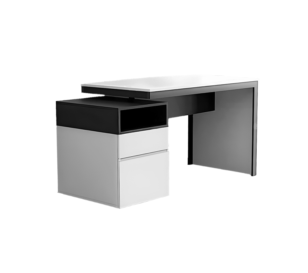 - Diseño Bicolor y Multitextura: El Escritorio Doha Deluxe impresiona por su contraste armónico de colores (aparentemente blanco, gris y negro) y la superposición de volúmenes, creando una estética contemporánea y de alta gama. Esta combinación no solo es visualmente atractiva, sino que también añade profundidad y carácter al espacio.