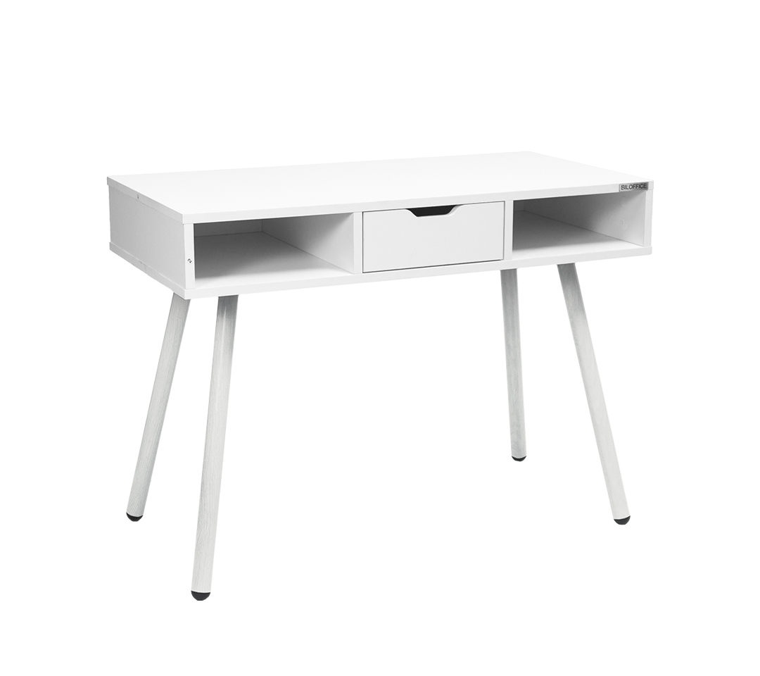 - Materiales: Superficie de madera con acabado blanco mate, combinada con patas de madera en tono natural, lo que aporta un estilo cálido y sofisticado.