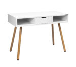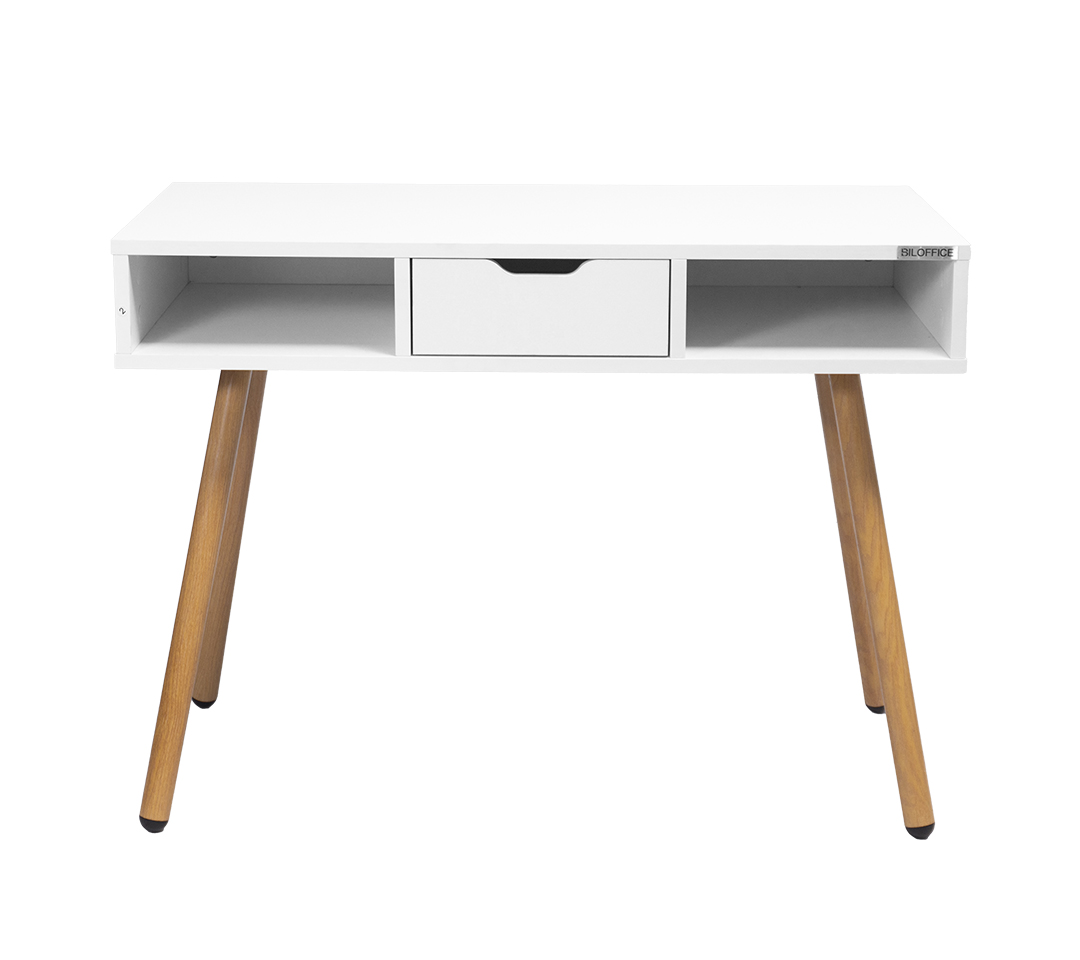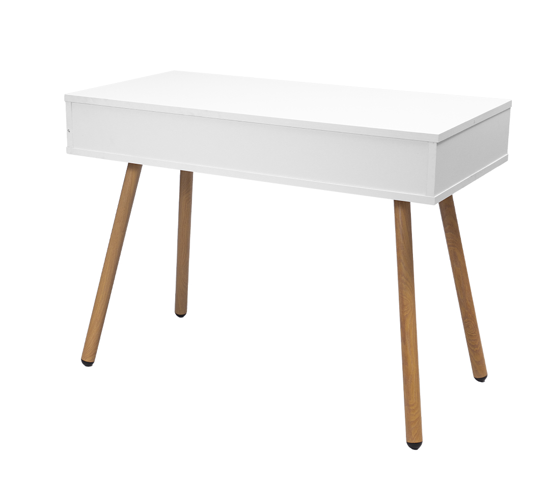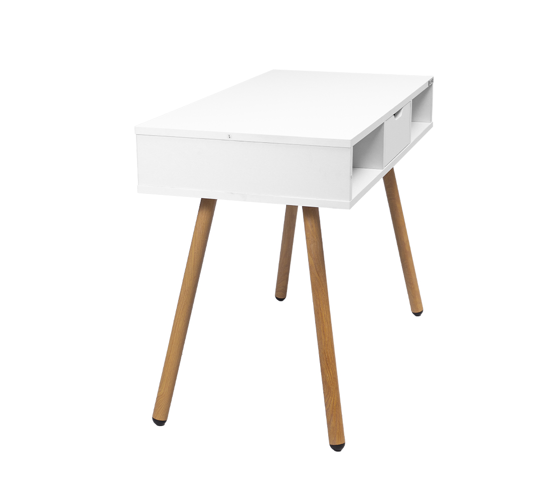 • Materiales: Superficie de madera con acabado blanco mate, combinada con patas de madera en tono natural, lo que aporta un estilo cálido y sofisticado.