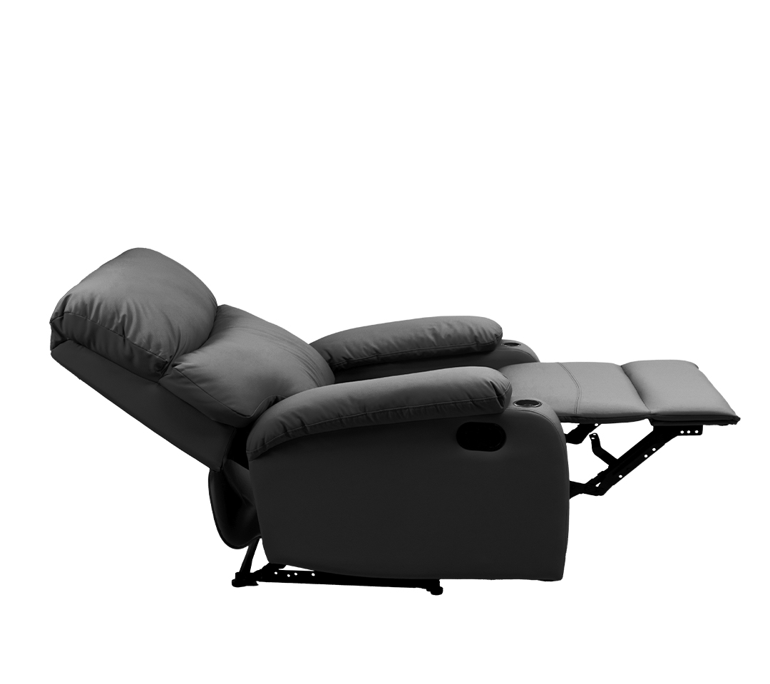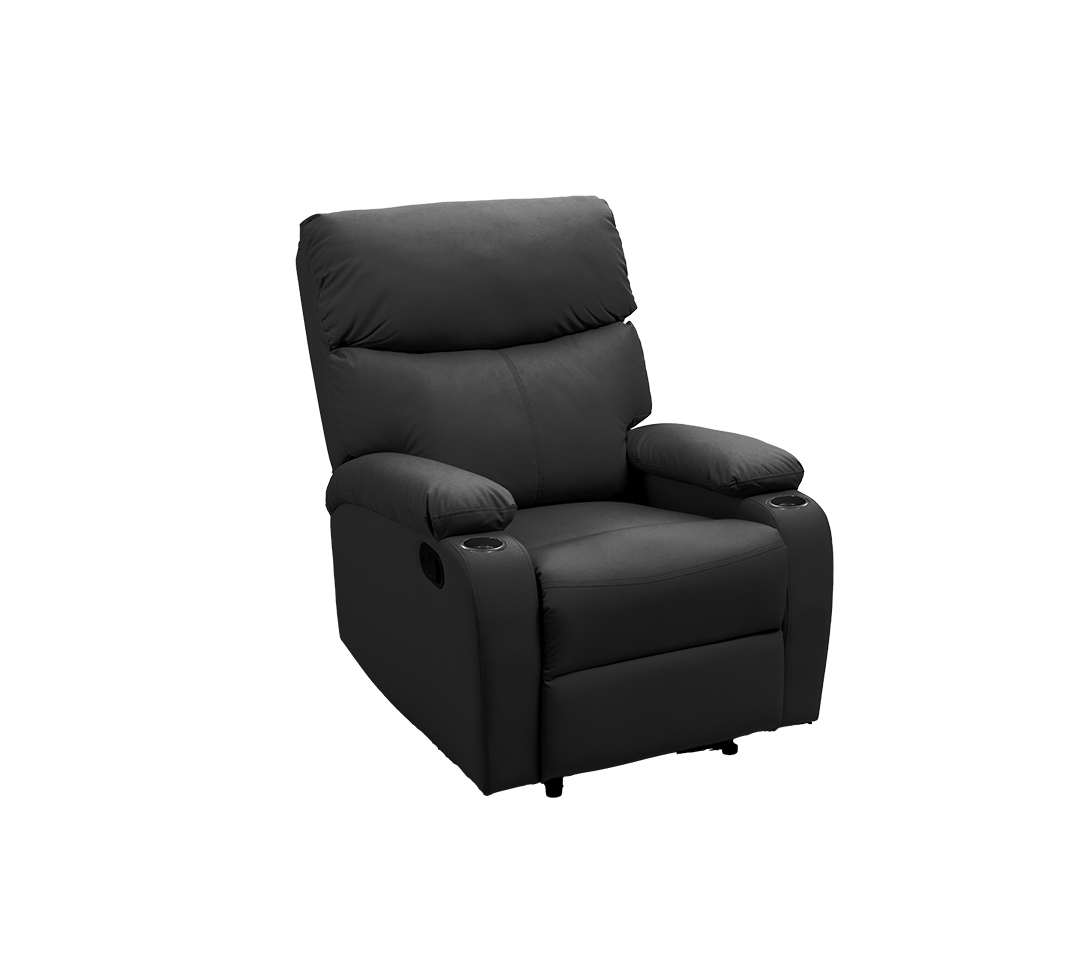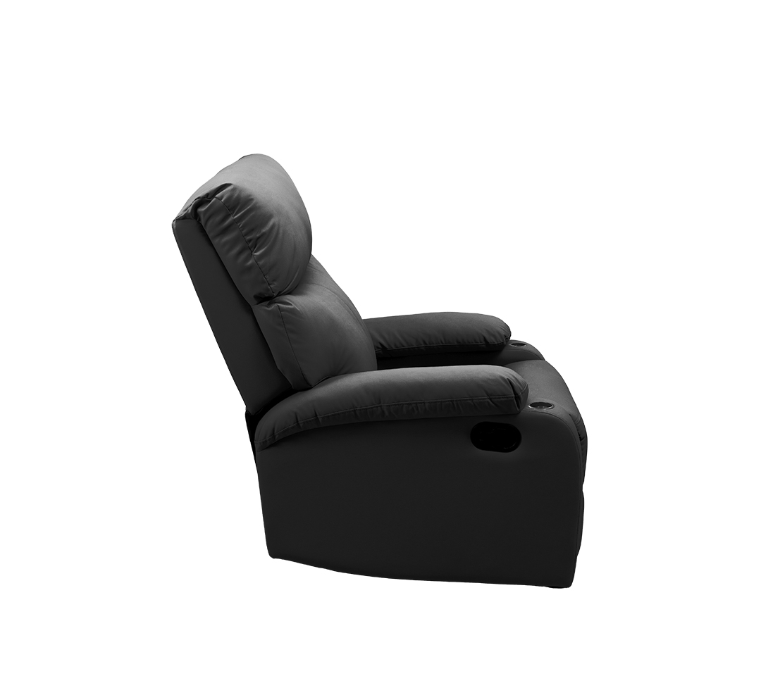 - Tapizado Premium: Vestida en un elegante material tipo cuero de color negro, la POLTRONA RECLINABLE PORTA VASOS ofrece una textura suave al tacto y una apariencia de alta gama.